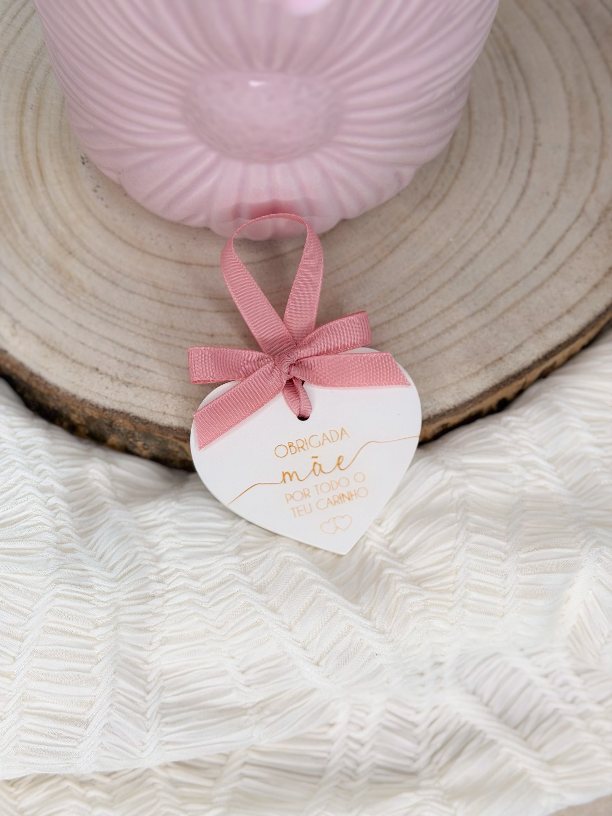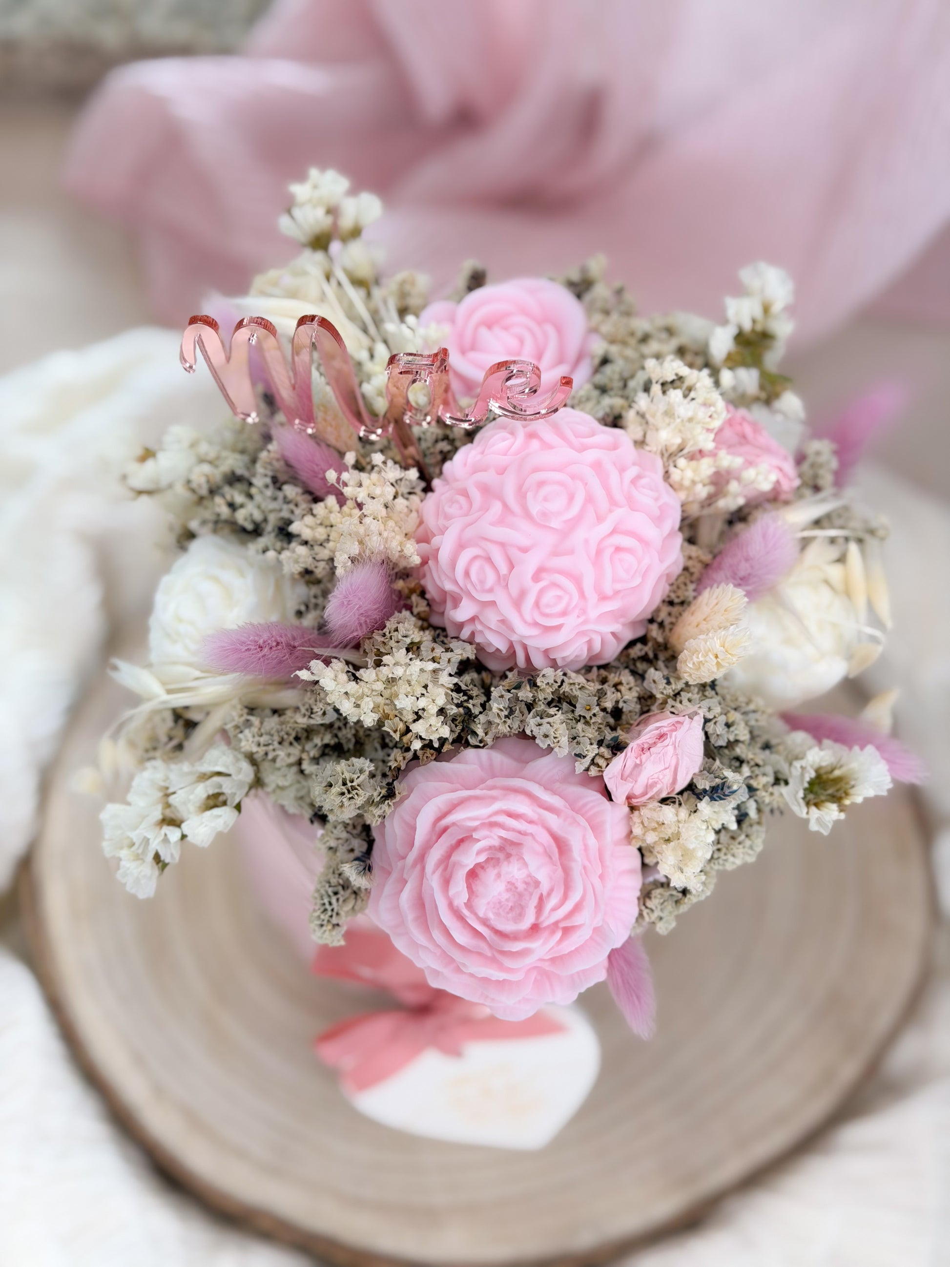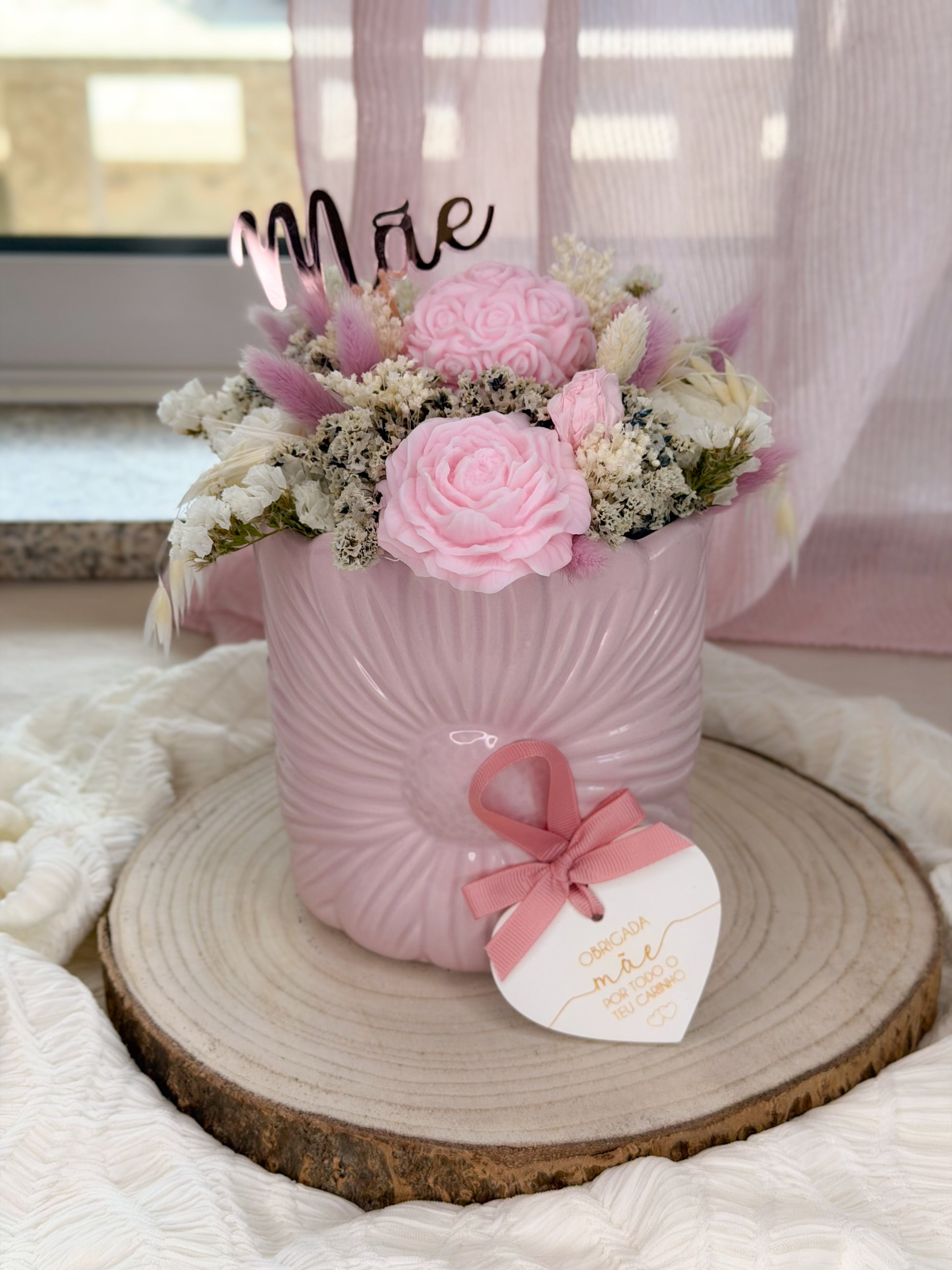Vaso em cerâmica, com arranjo floral de velas aromáticas, flores secas e acrílico Mãe. Cerâmica perfumada incluída “Obrigada Mãe por todo o teu carinho”
